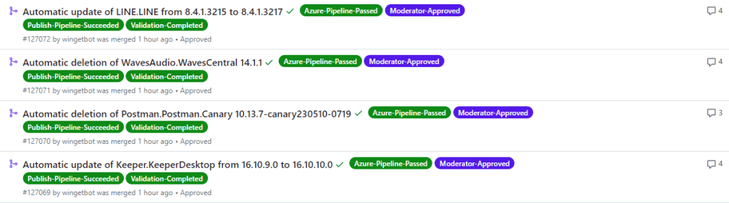 Currently the process for approving a new package update in Winget requires the final approval of a Winget moderator (real humans!) before it is successfully added into the repository. While this process adds an extra layer of assurance around package submission, we think there could be some exceptions for popular packages to help speed up the approvals. For example, if the Winget Bot submitted the latest version of Google Chrome and it passed all validation testing and malware scanning it should be automatically added into the repository without needing moderator approval. This would reduce the overhead for the moderators too!