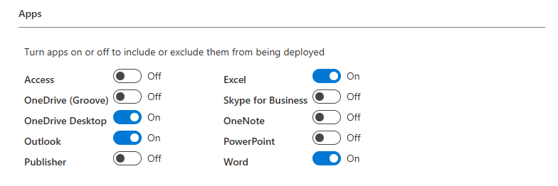 - Select the apps to include (e.g., Word, Excel, PowerPoint). This is a good opportunity to clean up and remove any Office applications that you don’t need on the device. For this demo we have removed less common apps like Publisher and Access. We have also removed Teams so we can manage this deployment via it’s own application.
