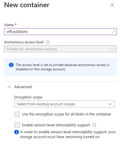 - In your storage account, create a container to host the XML file.