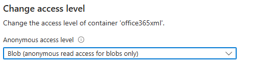 - Configure the container’s access level to allow public or authenticated access, depending on your security requirements. For this example, we are leaving it public. If you leave it private you will also need to provide a SAS token for authorization.