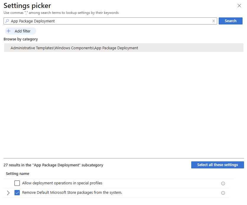 Next, you want to add the setting under Administrative Templates\Windows Components\App Package Deployment (simply search “App Package Deployment” and it will pop up in the results). Select the setting “Remove Default Microsoft Store packages from the system.“