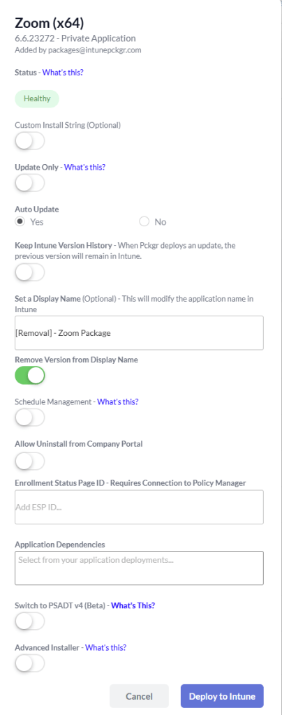 We also remove the version number from the display name, so it doesn’t distract from its purpose. This naming convention helps admins and even end users to clearly understand this is an uninstall-only package.
