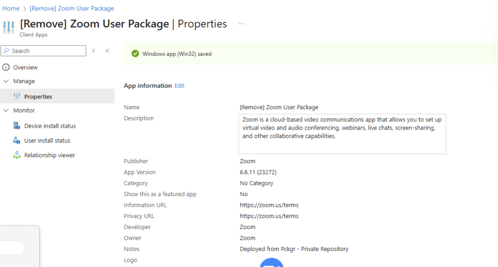 This time, we add the Zoom (User Install) package to the library and assign it to Uninstall for the same device group.