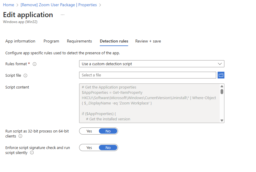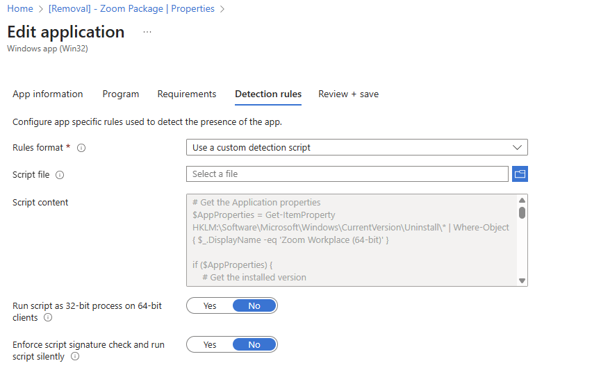 Pckgr uses detection scripts via Intune to determine if an app is present. The system version of Zoom checks the Local Machine registry, while the user version looks in the Current User registry.