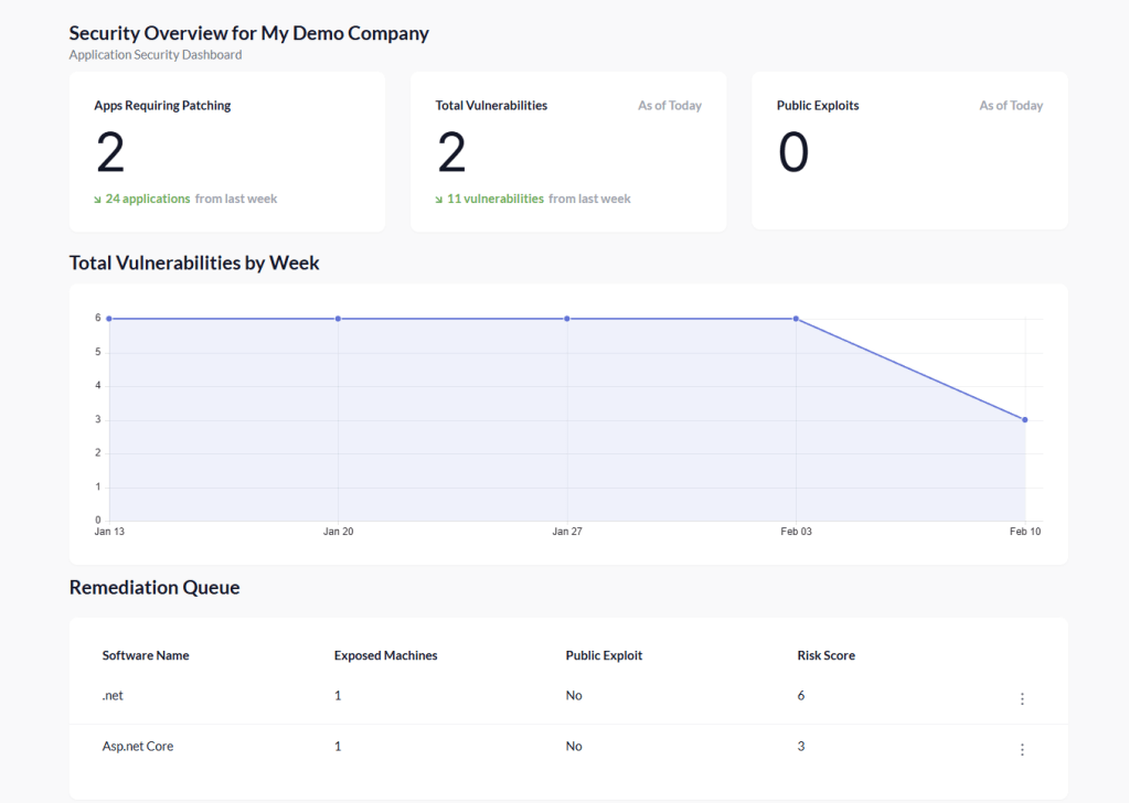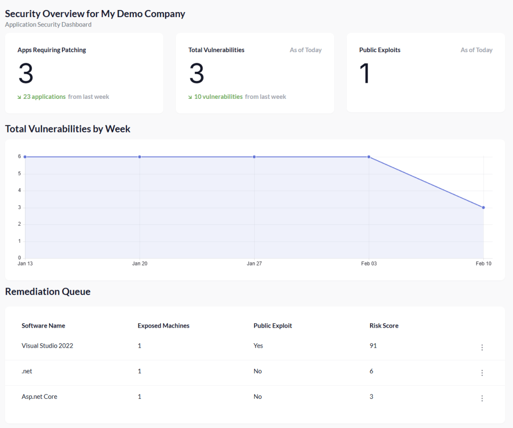 Opening the dashboard, we can immediately see a summary of applications that require patching. In this demo environment, Defender has identified three applications with known vulnerabilities.