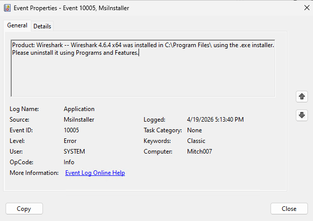 Product: Wireshark — Wireshark 4.6.4 x64 was installed in C:\Program Files\ using the .exe installer. Please uninstall it using Programs and Features.