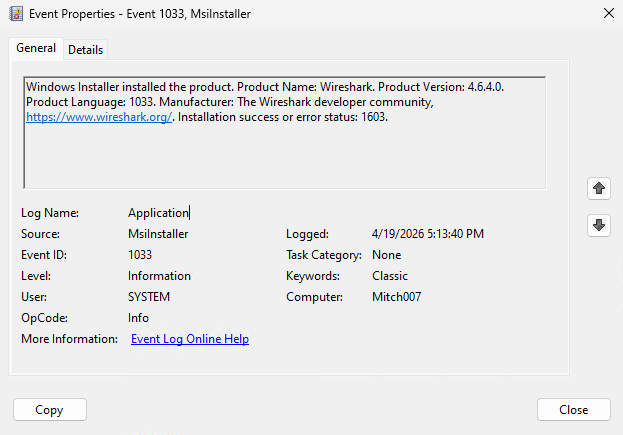 So the 1603 is not a broken installer, a corrupted MSI, or an Intune problem. It is Wireshark deliberately refusing to install on a device that already has the other variant. The frustrating part is that none of this shows up in the Intune failure message. You just see 1603 and have to go digging.