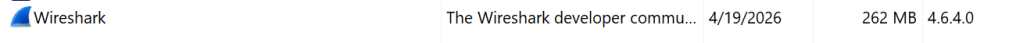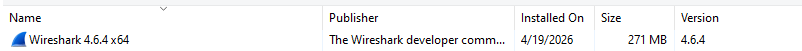 Step 1 – we downloaded the Wireshark EXE installer and installed it, simulating a user who has grabbed it themselves. The install completed without issue and the application showed up in Programs and Features as Wireshark 4.6.4 x64.
