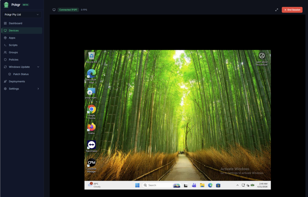 Pckgr’s Remote Desktop gives you browser-based remote control of any managed device, with privacy built in by design. The connection goes directly between your browser and the device, peer-to-peer. Screen frames, mouse and keyboard input, clipboard content, all of it stays between the two of you. Your screen content never passes through our infrastructure. We only help the two sides find each other.