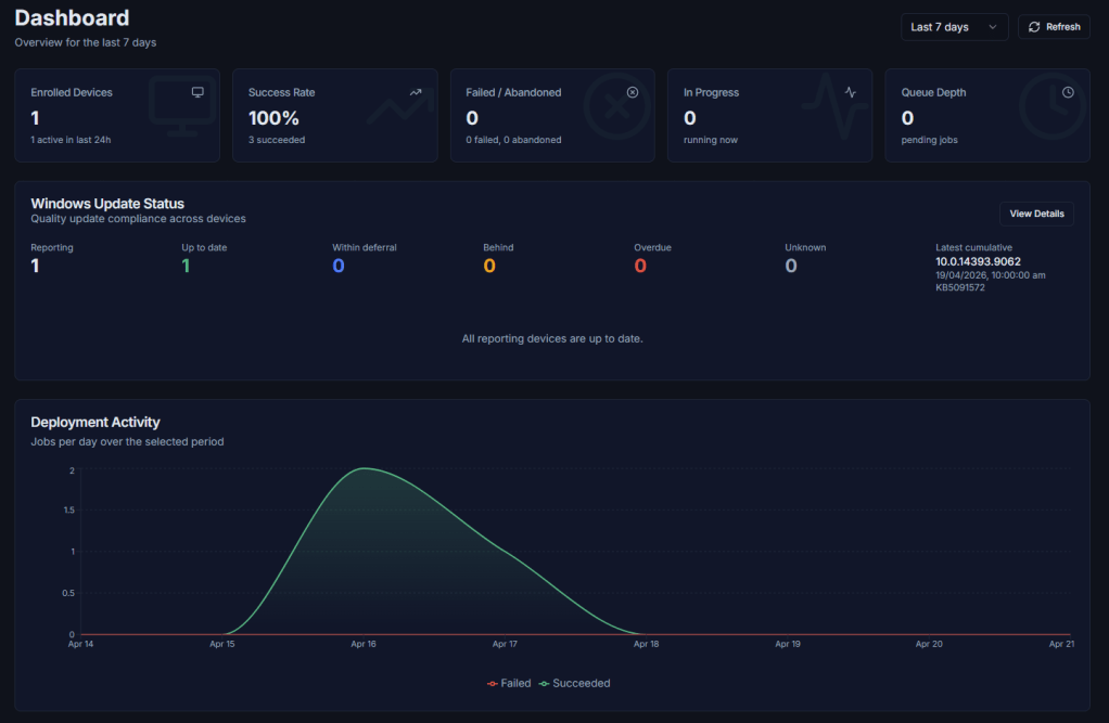 And the dashboard you land on after login pulls it all together: enrolled devices, success rate, in-progress counts, queue depth, update compliance, deployment activity charts, top failing apps, top failing devices, recent activity, performance stats, and idle-fleet alerts. One pane of glass over your whole fleet.