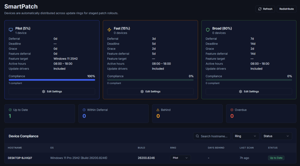 Enable Smart Patch and we automatically distribute your fleet across three opinionated rings: Pilot at 5% of devices, Fast at 15%, and Broad at 80%. Assignment is stable, so devices stay in the ring they were originally placed in. New enrolments slot into whichever ring is lightest, so the distribution stays proportional as you grow. You can tweak the percentages, deferral days, deadlines, grace periods, active hours, and driver exclusions on any ring, or pin a specific device to a specific ring if it needs special treatment.