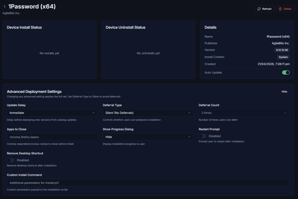 Every app you add in gets the full PSADT toolkit behind it. Defer prompts, install progress dialogs, restart prompts, running-app close behaviours, desktop and start-menu shortcut control, custom install commands. Configure it once per app and every device gets the same experience.