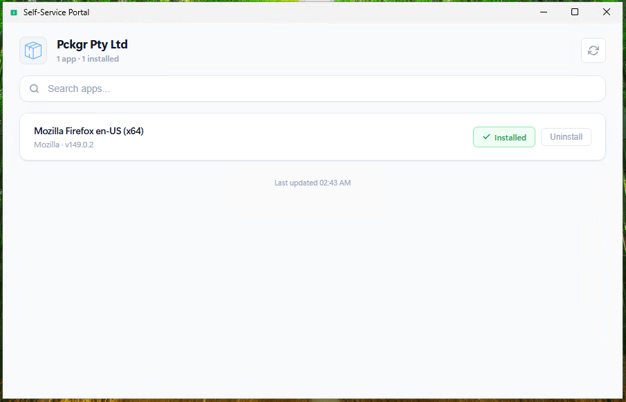 The Pckgr Portal includes a standalone self-service app that runs on the user’s device. Users can browse apps that admins have marked Available, install them on demand, and uninstall when they’re done. It’s fully branded with your company name and logo.