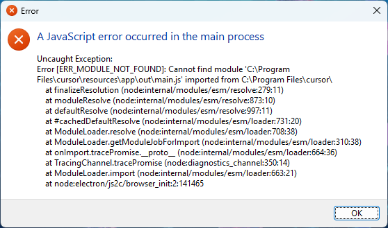 Cursor is an Electron app. When you run an installer over the top of an Electron app while it’s still running, you’re asking the installer to overwrite files in C:\Program Files\cursor\ that the running process has open and is halfway through using. Windows does its best to negotiate that, but the end state is often a half-updated install directory. Some files are the new version, some are the old, and some are missing entirely because they were held open and couldn’t be written. The next time you launch Cursor, it tries to load modules from paths that no longer match what’s on disk, and you get the ERR_MODULE_NOT_FOUND above.