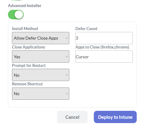 If you’re deploying Cursor, or any other Electron app, through Intune and you’re seeing failed installs after updates, open the package in Pckgr, turn on Advanced Installer, and set the install method to Allow Defer Close Apps with the app’s process name in the list. It takes about thirty seconds, and it will save a lot of support tickets.