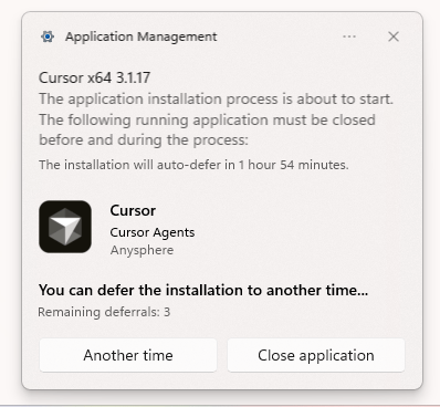 We flipped Advanced Installer on, set Install Method to Allow Defer Close Apps, added Cursor to the Apps to Close list, bumped Defer Count to 3, and redeployed. Next time an update rolled out to a machine with Cursor open, this is what the user saw: